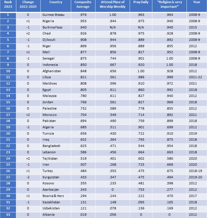 Sources: Three main sources are utilised: Most are taken from The Age Gap in Religion Around the World (Washington DC: Pew Center, June 13, 2018), Appendix B data is used for Afghanistan, Albania, Algeria, Azerbaijan, Burkina Faso, Bosnia & Herzegovina, Djibouti, Kosovo, Niger, Palestine, Senegal, and Uzbekistan. World Values Survey Wave 7 (2017-2022): Results in % by country weighted by w_weight. Study #WVS-2017-2022 v4.0 data is used for Bangladesh, Egypt, Indonesia, Iran, Iraq, Jordan, Kazakhstan, Kyrgyzstan, Lebanon, Libya, Maldives, Morocco, Pakistan, Tajikistan, Tunisia and Turkey. Data for Muslims in Muslim countries having large non-Muslim majorities – Chad, Guinea-Bissau, Malaysia, Mali and Nigeria – are derived from The World Muslims: Unity and Diversity (Washington DC: Pew Center, August 9, 2012), although the data is older than other sources that report for the whole population, not exclusively for Muslims. Note that this publication contains data on Sub-Sahara countries derived from Pew Center’s Sub-Saharan Africa Survey (2010) comprising 2008-2009 survey data. N/A = newly appearing country.