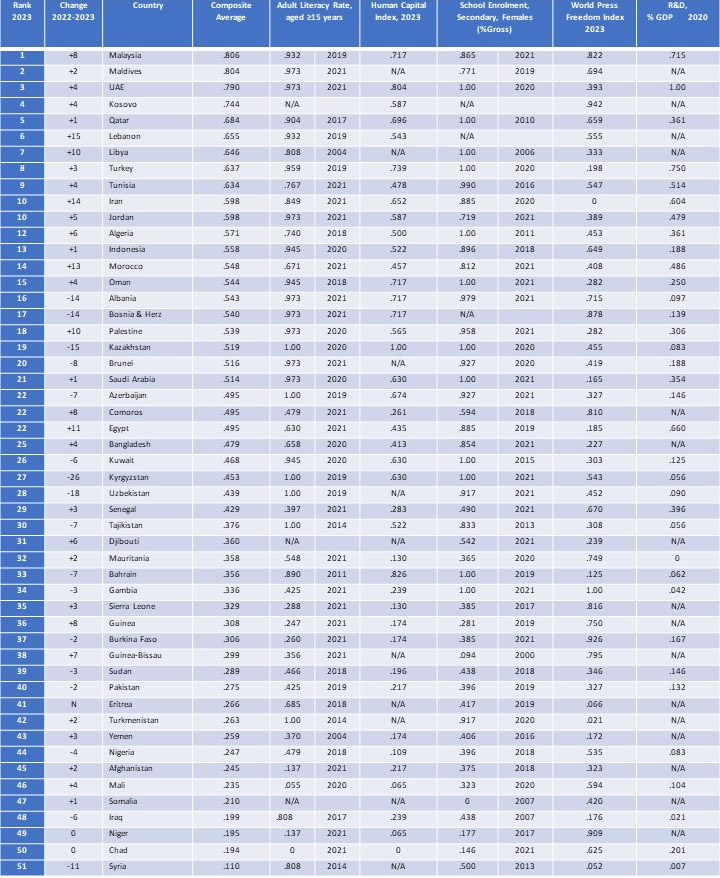 Sources: (1) Literacy rate, % aged 15 and above https://databank.worldbank.org/source/world-development-indicators/Series/SE.ADT.LITR.ZS (Accessed October 2, 2023) (2), Human Capital Index, World Bank, 2022, Wall Street Journal https://graphics.wsj.com/table/zumbrun_1010 (Accessed July 31, 2023) (3) World Bank, School enrolment, secondary, female (%gross). UNESCO Institute for Statistics. Data at October 24, 2022 https://data.worldbank.org/indicator/SE.SEC.ENRR.FE (Accessed October 2, 2023) (4) Reporters Without Borders, 2023 World Press Freedom Index https://rsf.org/en/2023-world-press-freedom-index-journalism-threatened-fake-content-industry (Accessed October 2, 2023). (5) Research and Development Expenditure as a proportion of GDP. http://data.uis.unesco.org/index.aspx?queryid=3684 (Accessed October 2, 2023) Note: N/A = data unavailable.