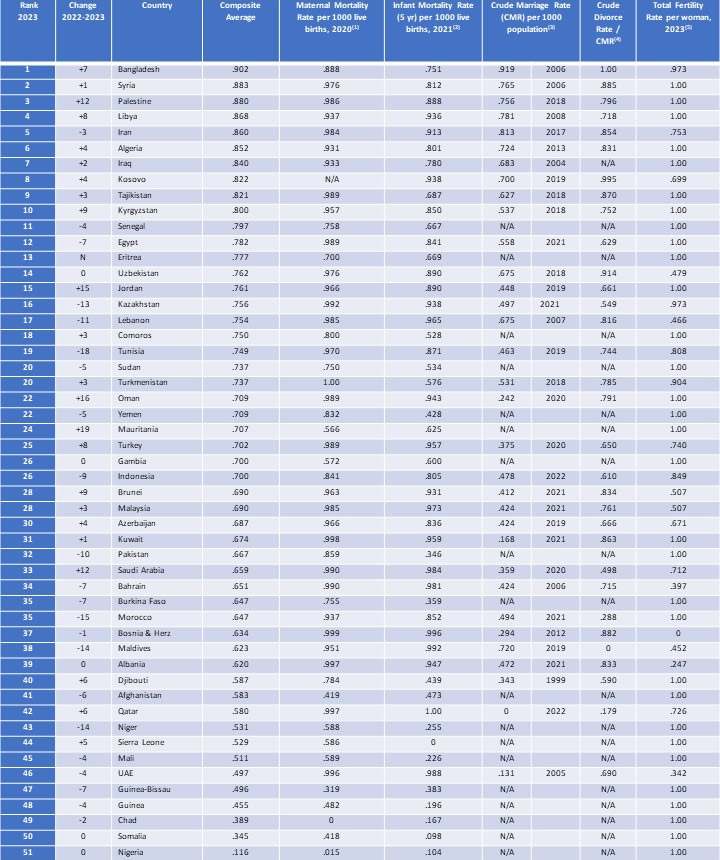Sources: (1) World Bank, Maternal Mortality Ratio https://data.worldbank.org/indicator/SH.STA.MMRT (Accessed June 23, 2022) (2) World Bank, Infant Mortality Rate https://databank.worldbank.org/source/world-development-indicators/Series/SP.DYN.IMRT.IN (Accessed October 2, 2023) (3) Crude Marriage Rate based mainly on Wikipedia, Divorce Demography https://en.wikipedia.org/wiki/Divorce_demography (Accessed October 2, 2023) and UN, World Marriage Data 2008. Annual Number of Marriages and Crude Marriage Rates https://www.un.org/en/development/desa/population/publications/dataset/marriage/data.asp (Accessed June 19, 2022). Other Sources – Azerbaijan 2019. https://countryeconomy.com/demography/marriages/azerbaijan (Accessed October 2, 2023) Brunei 2021. https://deps.mofe.gov.bn/SitePages/Vital%20Statistics.aspx Egypt 2021. https://www.capmas.gov.eg/Admin/News/PressRelease/2022823122131_666%20e.pdf (Accessed October 2, 2023) Indonesia 2022. https://www.statista.com/statistics/705540/number-of-muslim-marriages-in-indonesia/ (Accessed October 2, 2023) Kuwait 2021. https://www.arabtimesonline.com/news/marriage-and-divorce-rate-increases-in-kuwait/ (Accessed October 2, 2023) Malaysia 2021. https://www.dosm.gov.my/portal-main/release-content/marriage-and-divorce-statistics-malaysia-2022 (Accessed October 2, 2023) Maldives 2019. http://statisticsmaldives.gov.mv/yearbook/2020/wp-content/uploads/sites/7/2020/12/3.25.pdf (Accessed October 2, 2023) Morocco 2021. https://www.statista.com/statistics/1297511/number-of-marriages-in-morocco/ (Accessed October 2, 2023) Oman 2020. https://omannews.gov.om/topics/en/80/show/106816 (Accessed June 19,2022) Qatar 2022. December 2022 Example. https://www.psa.gov.qa/en/statistics/Statistical%20Releases/General/QMS/QMS_PSA_108_Jan_2023_poster.pdf (Accessed October 2, 2023) Tunisia 2021. https://www.statista.com/statistics/1185217/number-of-marriages-in-tunisia/ (Accessed October 2, 2023) Turkmenistan 2019. https://knoema.com/data/turkmenistan+marriages (Accessed June 19, 2022). For Albania, Kosovo, Turkey https://ec.europa.eu/eurostat/statistics-explained/index.php?title=Marriage_and_divorce_statistics (Accessed October 2, 2023). For Kyrgyzstan, Palestine, Tajikistan, Uzbekistan 2018. https://www.statista.com/statistics/1226437/marriage-rate-worldwide-by-country/ (Accessed October 2, 2023) (4) Sources for country crude divorce rates, see CMR sources. Turkmenistan – https://knoema.com/data/turkmenistan+general-divorce-rate (Accessed June 19, 2022) (5) The CIA, World Factbook, Total Fertility Rate https://www.cia.gov/the-world-factbook/field/total-fertility-rate/ (Accessed October 2, 2023)