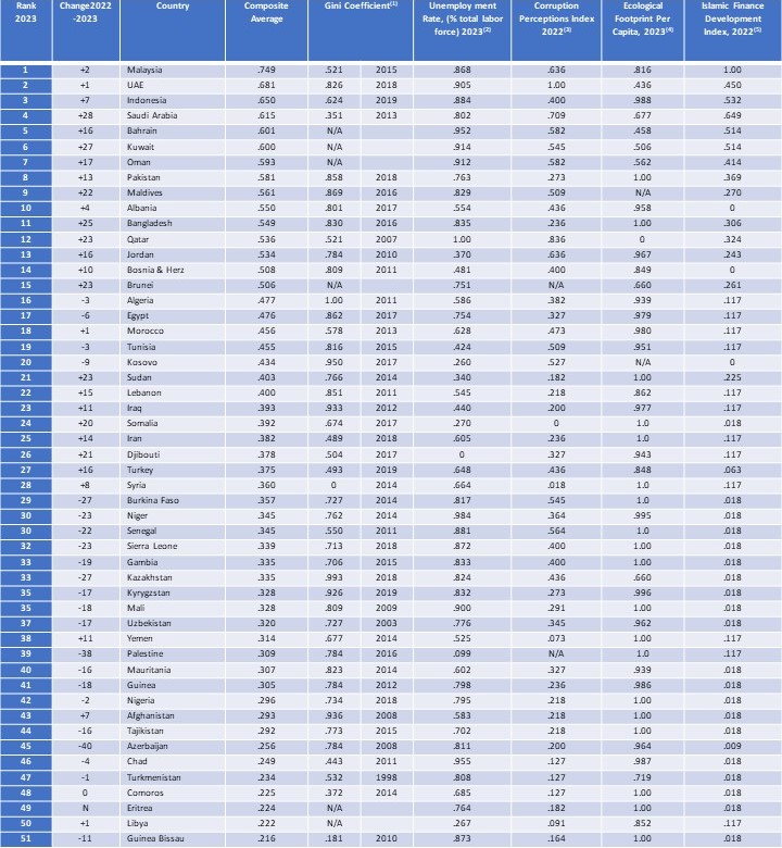 Sources: (1) World Population Review 2022, Gini Coefficient by Country 2023 https://worldpopulationreview.com/country-rankings/gini-coefficient-by-country (Accessed October 4, 2023); Afghanistan, Azerbaijan, Qatar, Saudi Arabia see CIA.gov The World Factbook, Country Comparison: Gini Index Coefficient – distribution of family incomes https://www.cia.gov/the-world-factbook/field/gini-index-coefficient-distribution-of-family-income/country-comparison/ (Accessed October 4, 2023); Kosovo and Syria see Wikipedia , List of Countries by Income Inequality https://en.wikipedia.org/wiki/List_of_countries_by_income_equality (2) UN Statistical Division, The Sustainable Development Goals Report 2023. Special Edition, 10 July 2023 https://unstats.un.org/sdgs/report/2023/ (Accessed September 30, 2023); Afghanistan Unemployment Rate https://www.statista.com/statistics/808214/unemployment-rate-in-afghanistan/ (Accessed October 4, 2023) and Palestinian Territory Unemployment Report, CEIC March 2023 https://www.ceicdata.com/en/indicator/palestinian-territory-occupied/unemployment-rate (Accessed October 4, 2023) (3) Transparency International, Corruption Perceptions Index 2022 https://www.transparency.org/en/cpi/2022 (Accessed October 4, 2023) (4) World Population Review 2023 https://worldpopulationreview.com/country-rankings/ecological-footprint-by-country (Accessed October 4, 2023 (5) ICD-Refinitiv, Islamic Finance Development Report 2022: Embracing Change, pp. 12-13. https://www.refinitiv.com/en/resources/special-report/islamic-finance-development-report-2022 (Accessed October 4, 2023 Note: N/A = Data unavailable.